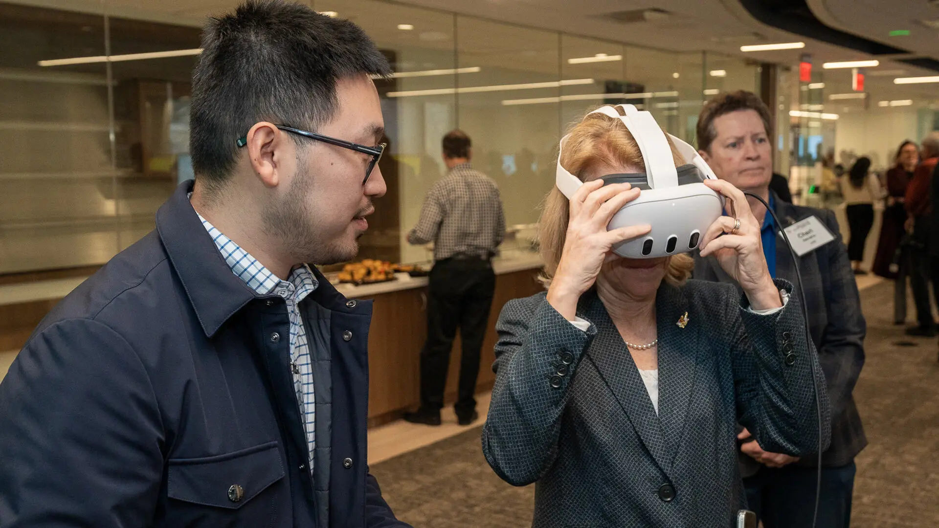 UMCP Senior Vice President and Provost Jennifer King Rice dons a VR headset to sample a physician assistant training module on Monday during a research showcase at the University of Maryland Institute for Health Computing, while Sida Li (left), associate director of immersive visualization at the institute and Cheri Hendrix (right), UMB Physician Assistant Program director, look on.