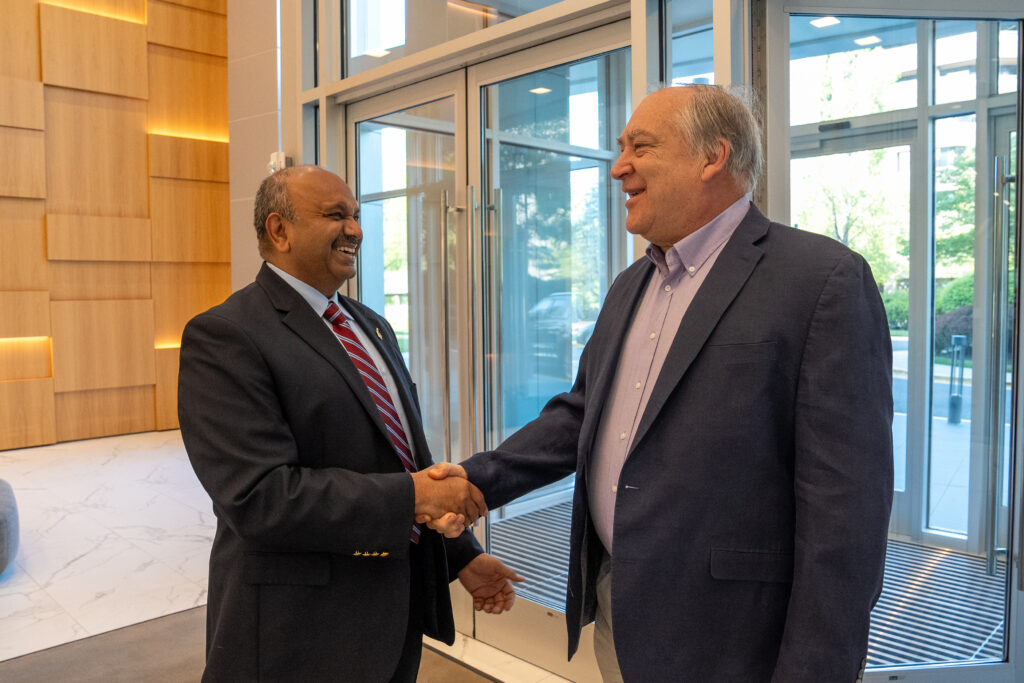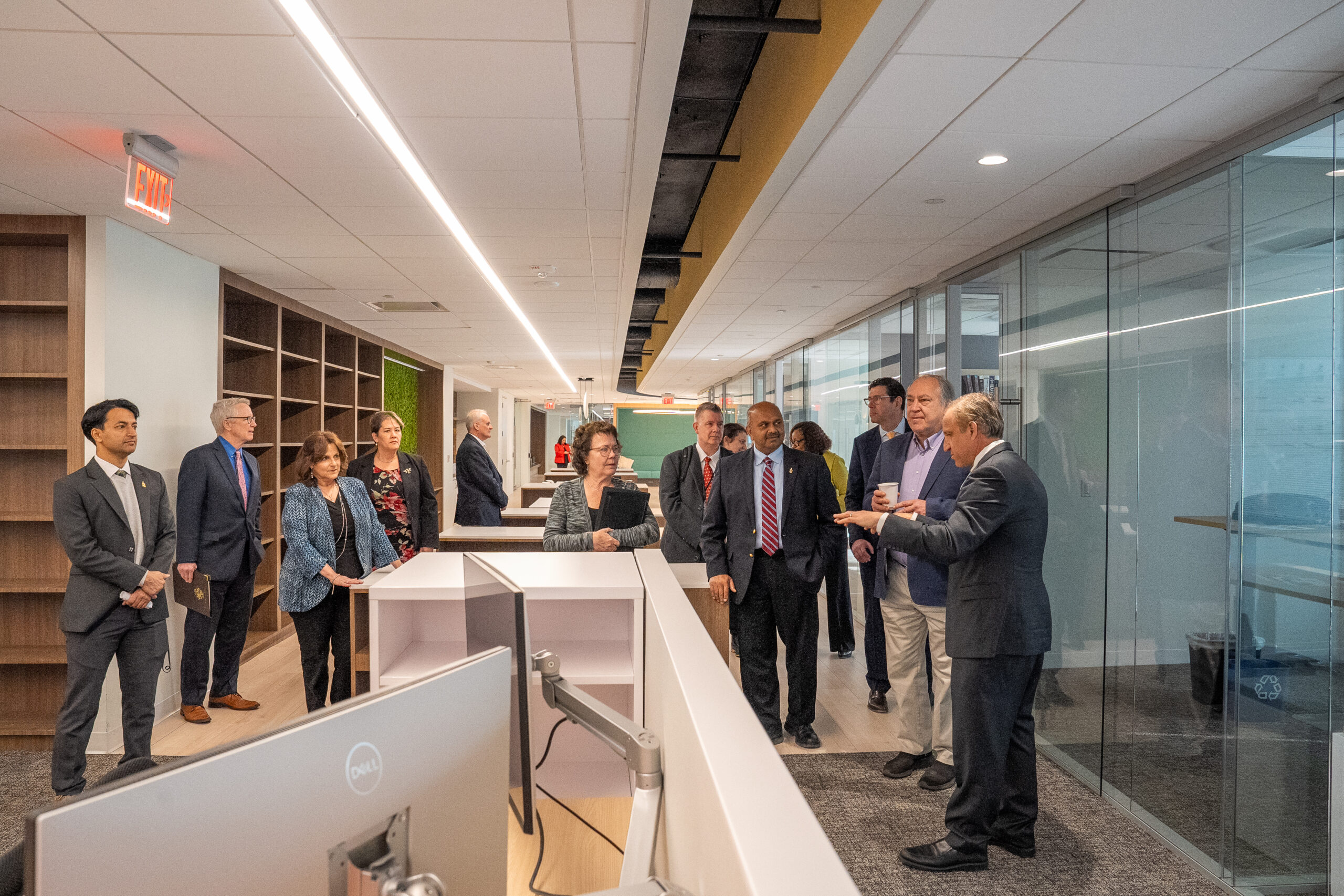 The University of Maryland Institute for Health Computing (UM-IHC) hosted Montgomery County Executive Marc Elrich on Tuesday, April 23, 2024, in its new North Bethesda offices. Elrich and his team were joined by representatives from federal agency National Institutes of Health (NIH) and companies Kaiser Permanente, US Pharmacopeia, and ThermoFisher.
