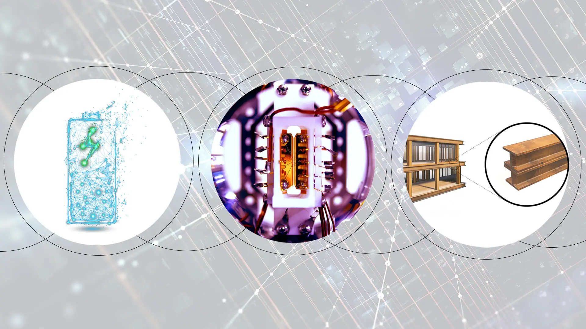 From left: background and battery image by Adobe Stock; computer chip image courtesy of Quantum Starup Foundry, wood image courtesy of Inventwood.