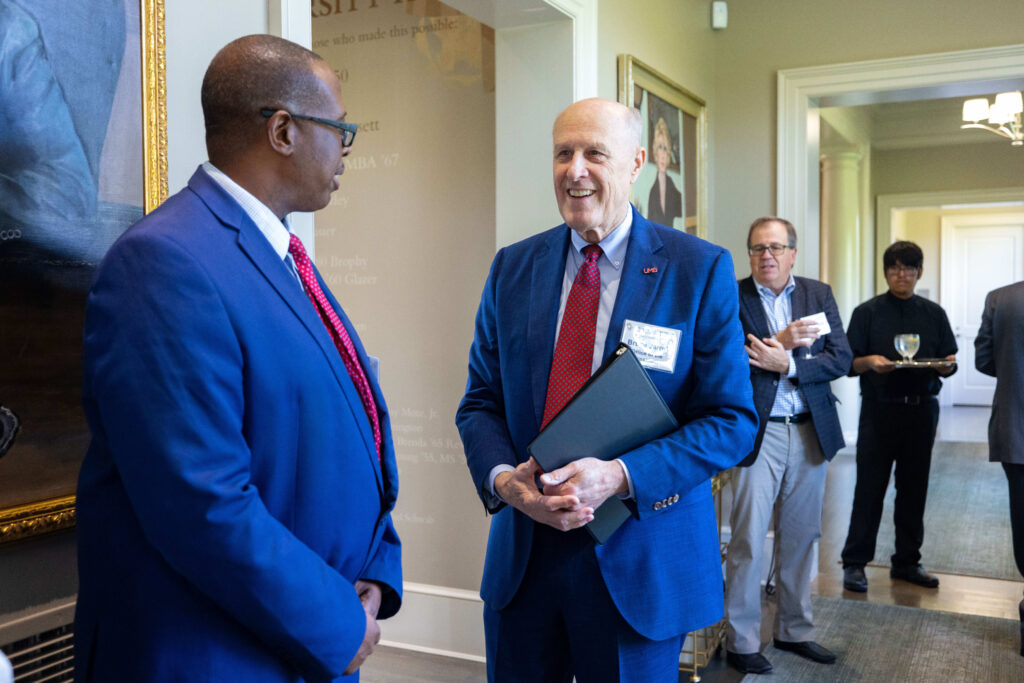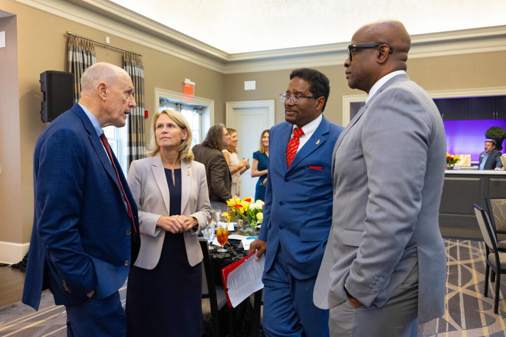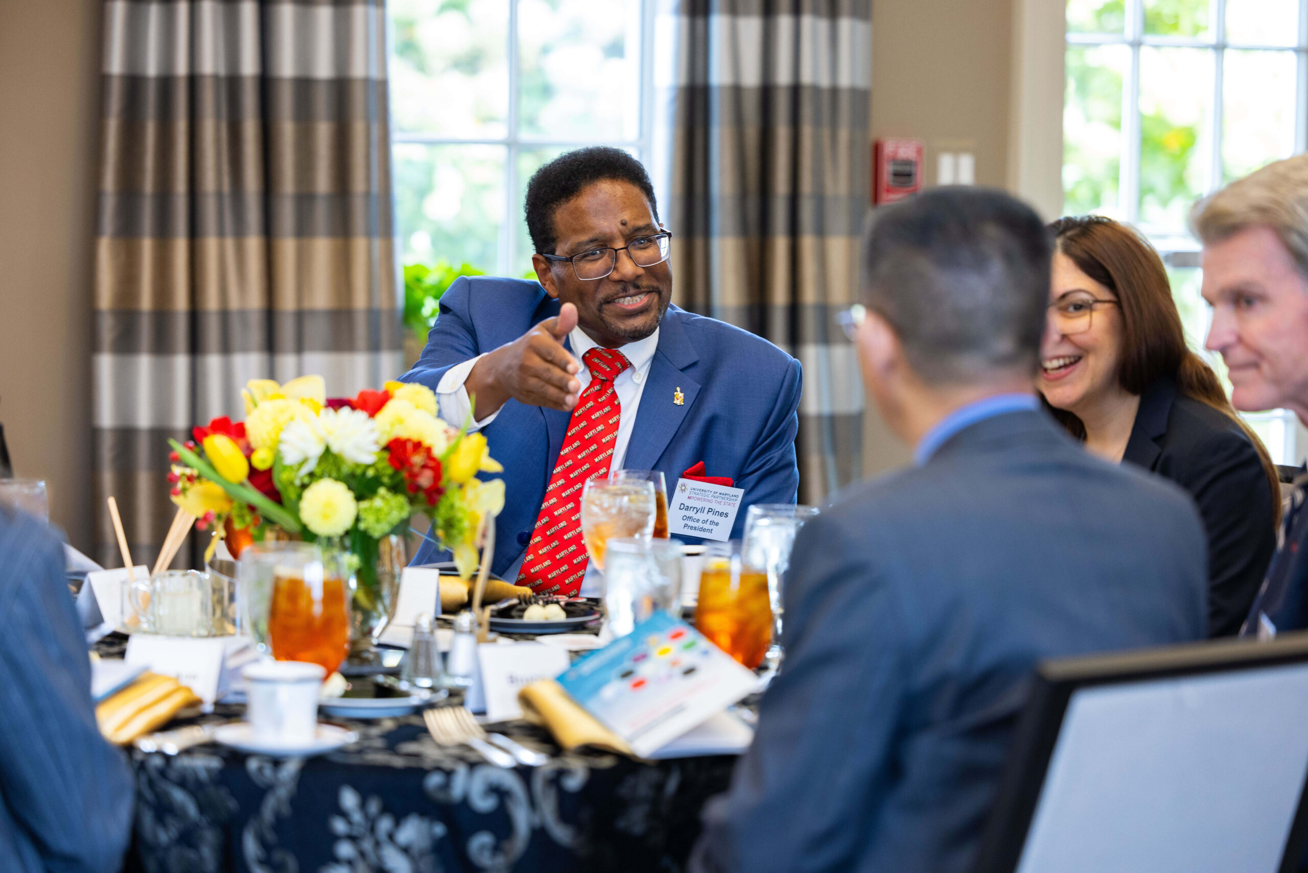 Three cohorts of MPower Professors, appointed in 2021, 2022, and 2023, were honored at the event, which was held at University House in College Park, MD. The luncheon was hosted by presidents Darryll Pines, PhD, UMCP and Bruce Jarrell, MD, UMB, together with the MPower Steering Council Jennifer King Rice, PhD and Provost, UMCP, Roger Ward, EdD, JD, MSL, MPA, Provost, and Executive Vice President, UMB, Michele Eastman, MA, MEd, Chief of Staff and Assistant President, UMCP, and Peter Crino, MD, PhD, Chair, Department of Neurology, University of Maryland School of Medicine, UMB. Deans from 10 Schools and Colleges also attended, as well as Vice President for Research Greg Ball, PhD, and department chairs. The presidents from both UM campuses spoke to the professors honored.