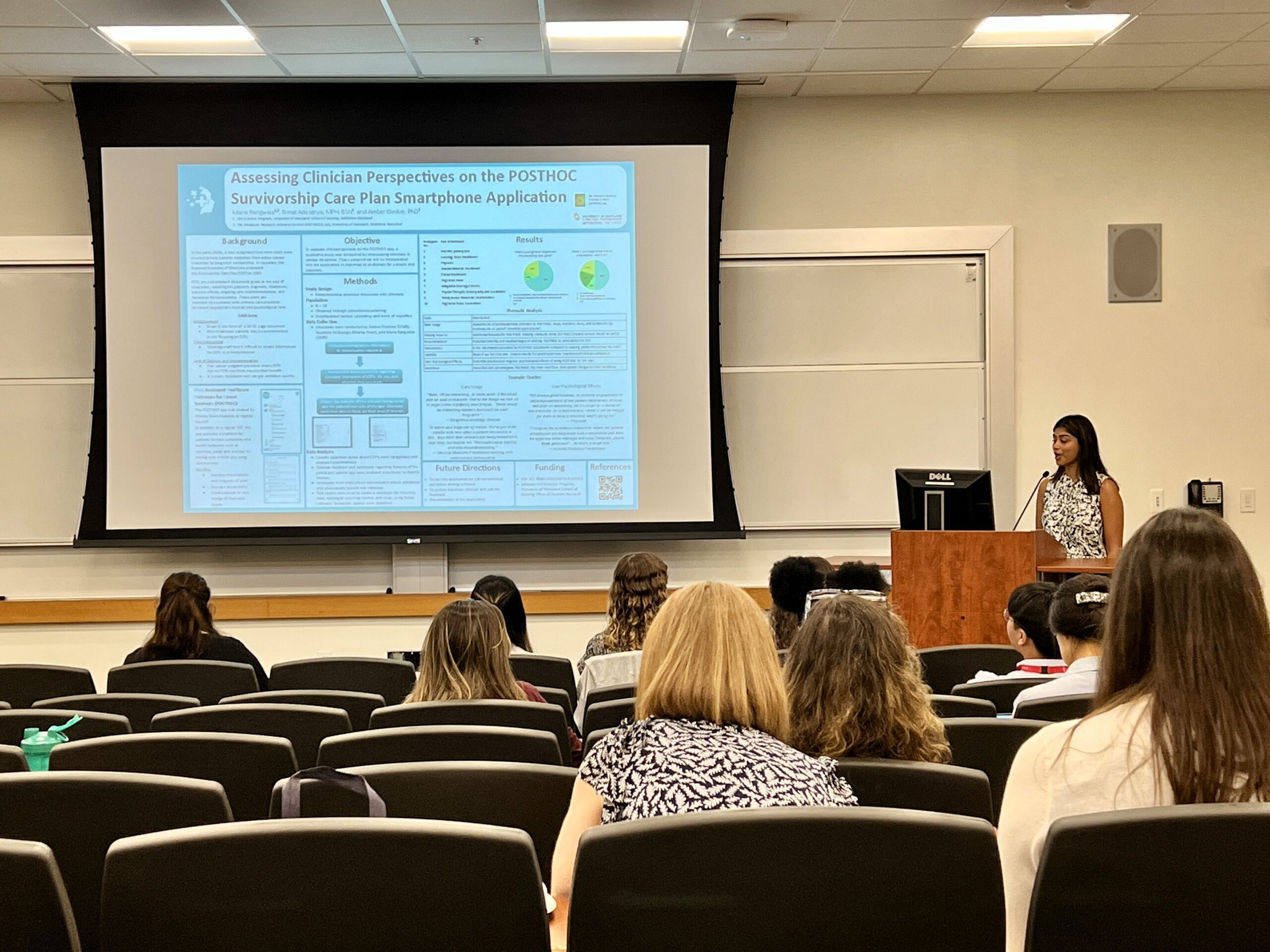 The Summer 2024 Olympics in Paris had already been in play for about a week when 10 young researchers took to a podium of their own, this one in an auditorium-style classroom at UMSON in Baltimore. These UM Scholars, all students at the University of Maryland, College Park (UMCP), had spent the past nine weeks immersed in intensive projects with faculty researchers at the School of Nursing, exploring topics such as pain, cancer-related fatigue, and shared decision-making in childbirth. On Aug. 1, during an end-of-program celebration, they took to the podium to present their findings to their fellow scholars, their faculty mentors, and faculty and staff who had gathered to hear about the results.