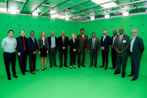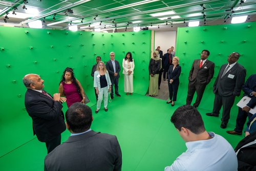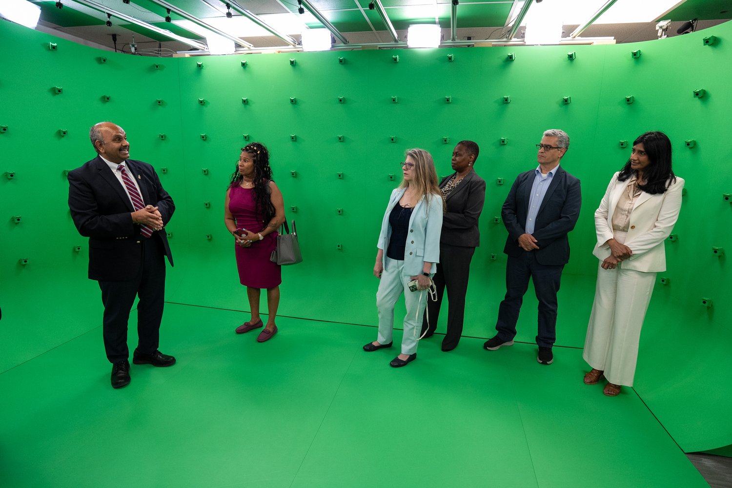 In addition to discussing how technology research and development can help solve the world’s most pressing issues and drive economic development for the state, the group toured the HoloCamera studio. One of UM-IHC’s immersive visualization research projects, this advanced camera system enables futuristic teaching and learning methods and has been used by physician assistant students at the University of Maryland, Baltimore. Researchers used the system’s 300 imaging devices to create virtual reality training scenarios depicting treatment that students can “step into” and view the procedure from all angles. The National Science Foundation-funded project is led by Amitabh Varshney, dean of UMCP’s College of Computer, Mathematical, and Natural Sciences and a professor of computer science.