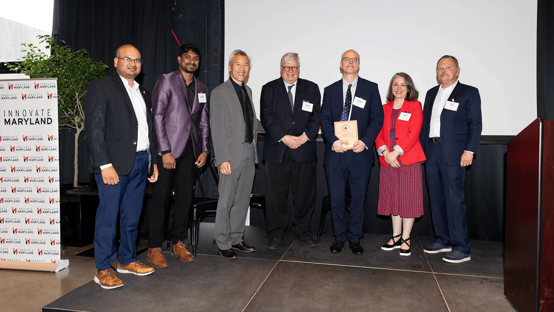MPower Professor Wolfgang Losert, one of the winners of UMD’s Invention of the Year competition, holds a plaque onstage at Innovate Maryland on Tuesday. Also pictured (L to R): UM Ventures Innovation Managers Virinchi Juttukonda and Ashwin Ramanujam, Chief Innovation Officer Dean Chang, Vice President for Research Gregory F. Ball, UM Ventures Associate Director Felicia Metz and UM Ventures-College Park Director Ken Porter. Photos by Mike Morgan.